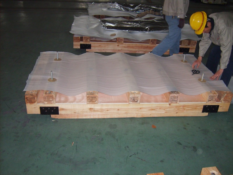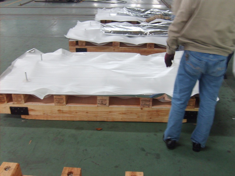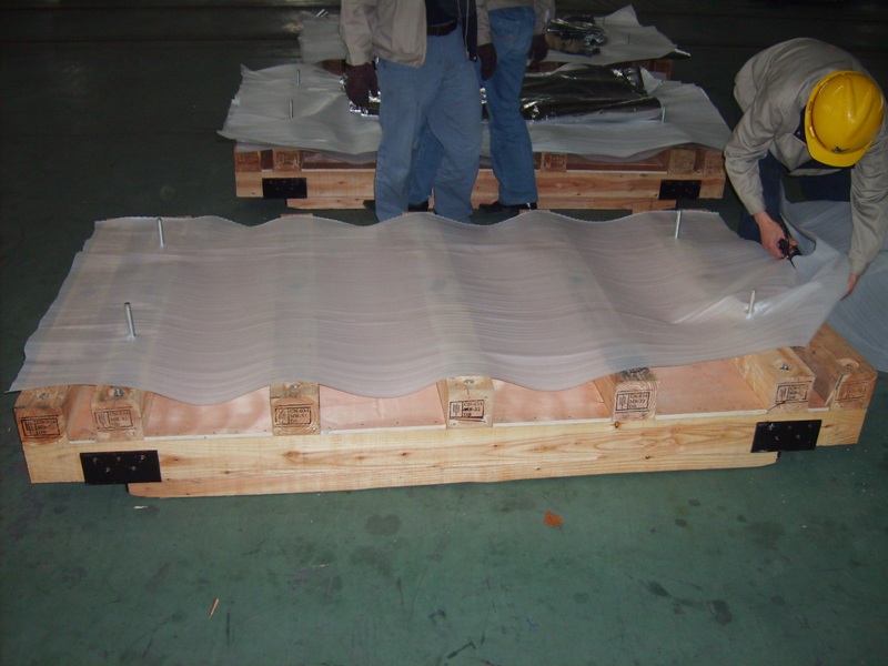 內(nèi)容:在鋁箔片上的螺栓上套上密封墊片,然后再鋪一層EPE膜,防止產(chǎn)品上的尖銳部位將鋁箔片壓壞
