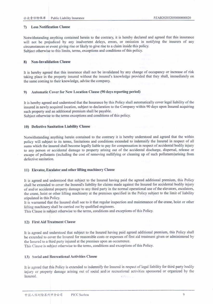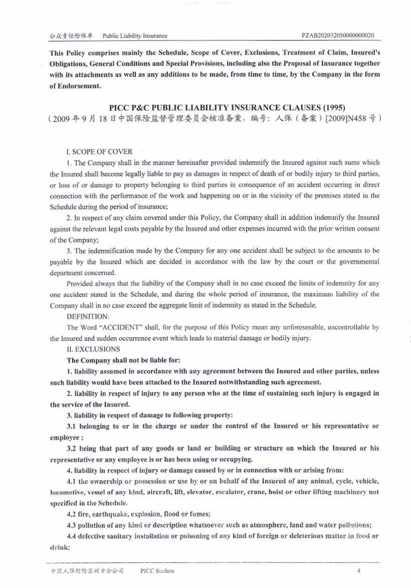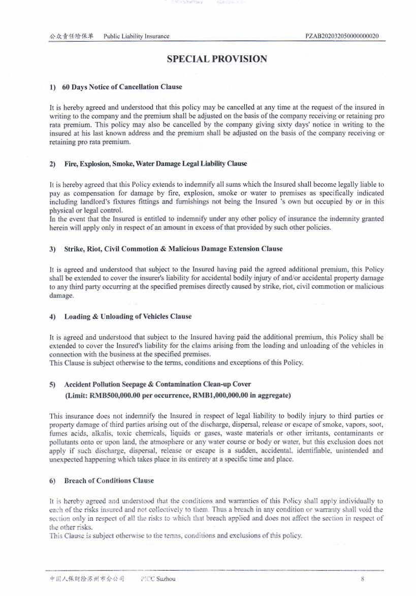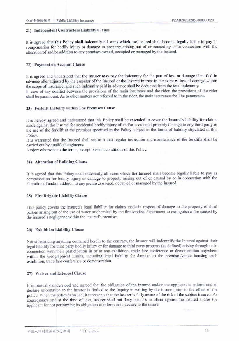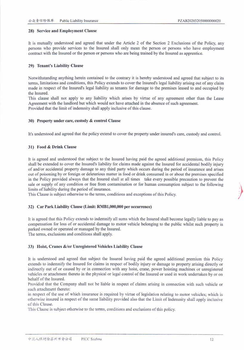 公眾責(zé)任保險(xiǎn) Policy No.:PZAB202032050000000020(英文版)