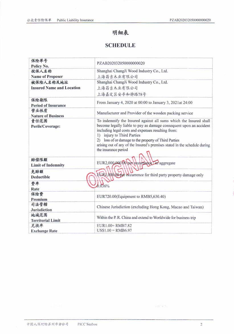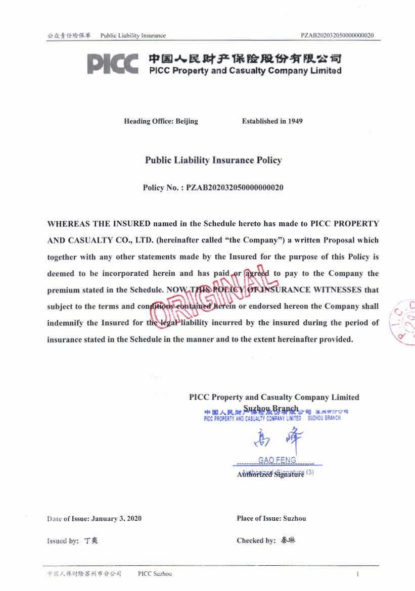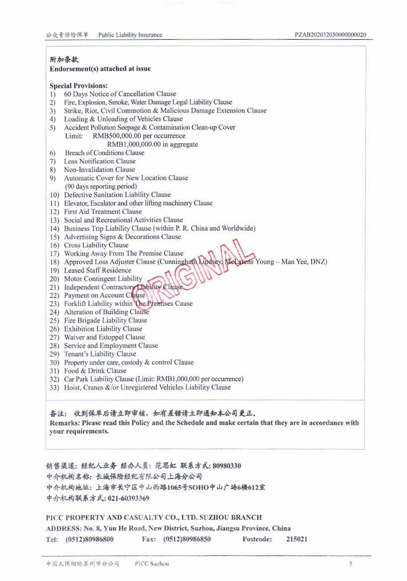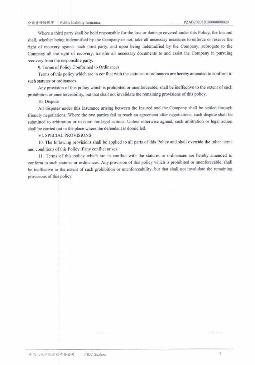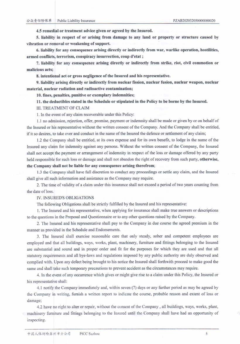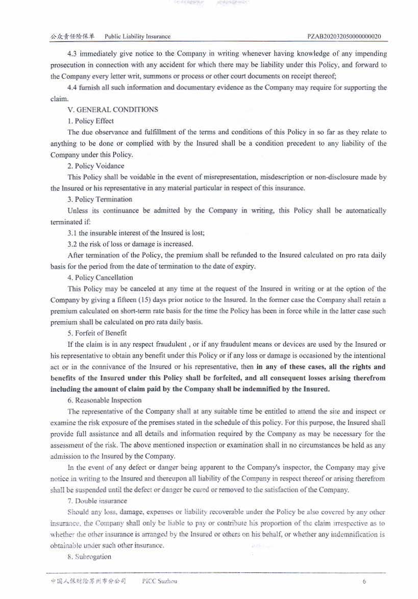 公眾責(zé)任保險(xiǎn) Policy No.:PZAB202032050000000020(英文版)