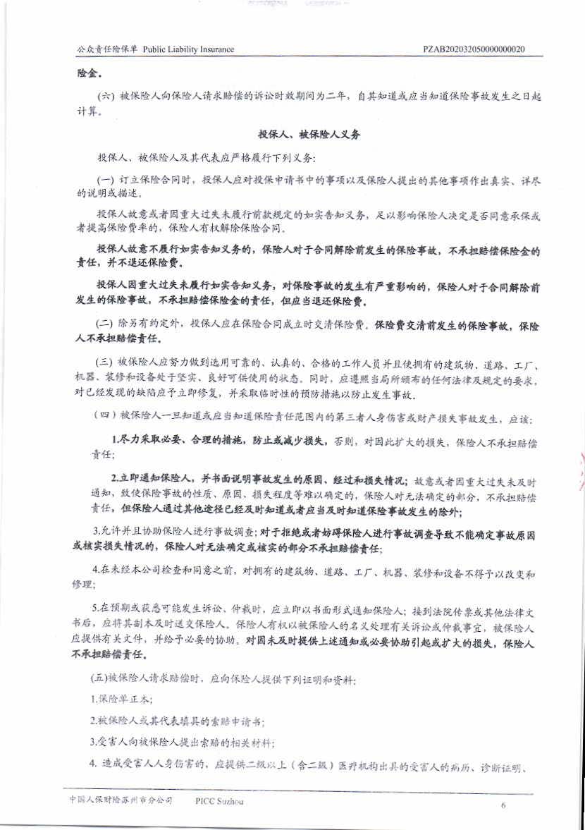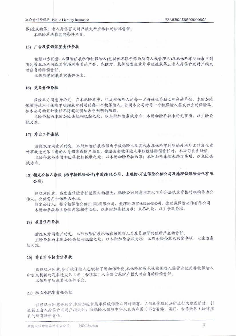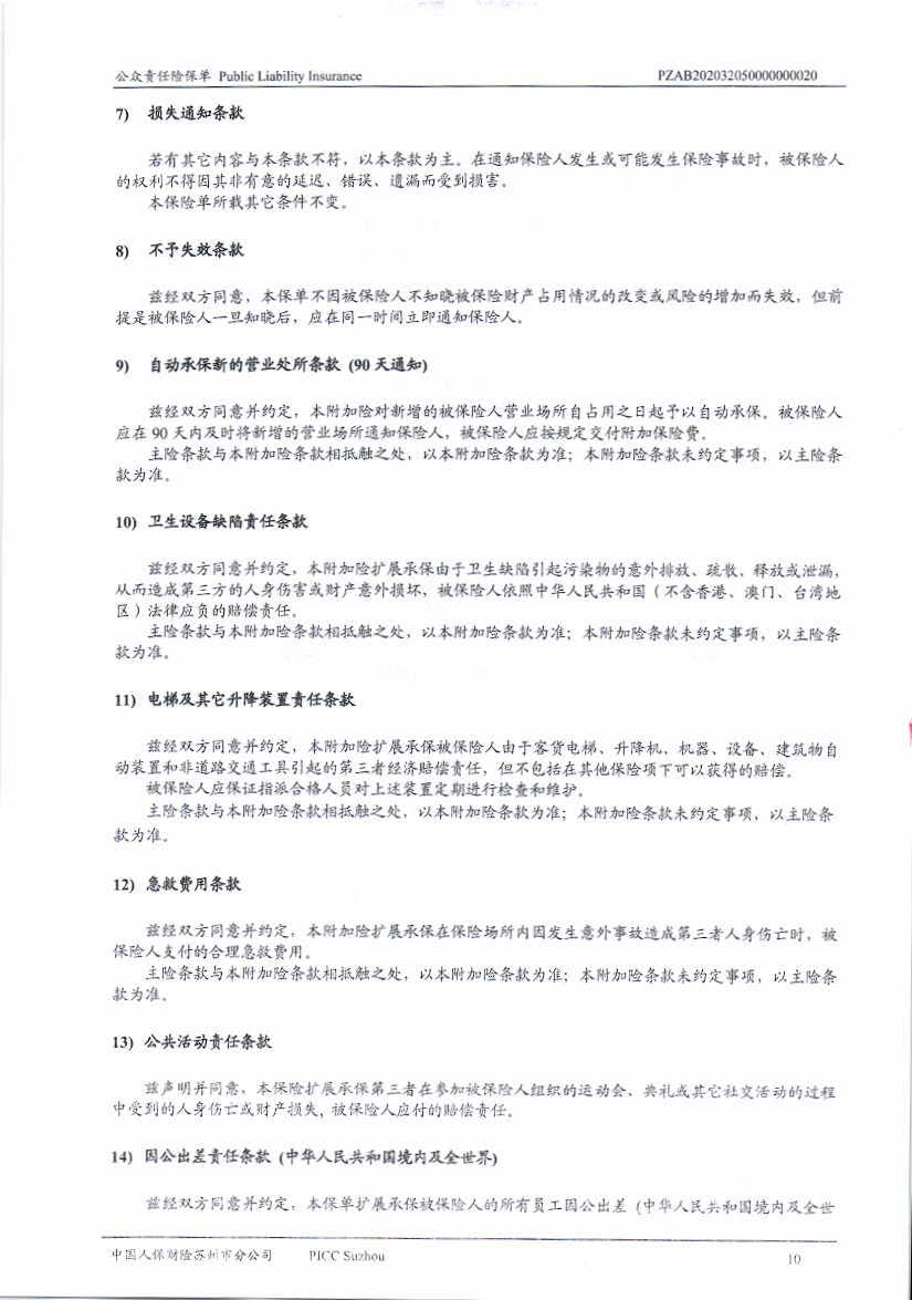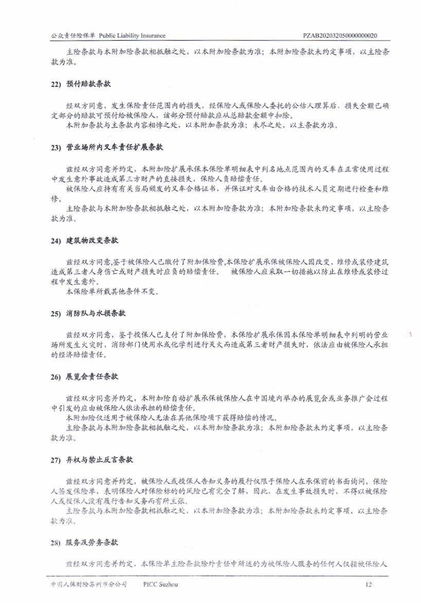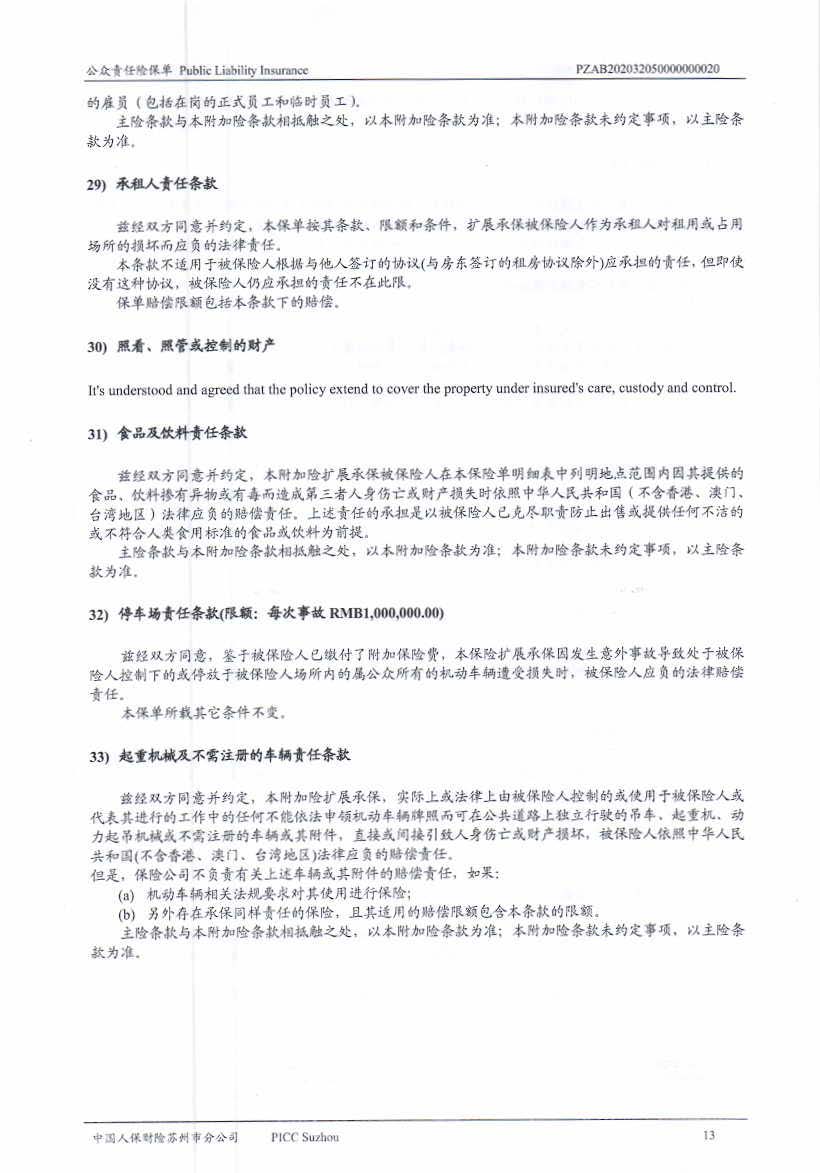 公眾責(zé)任保險 Policy No.:PZAB202032050000000020(中文版)