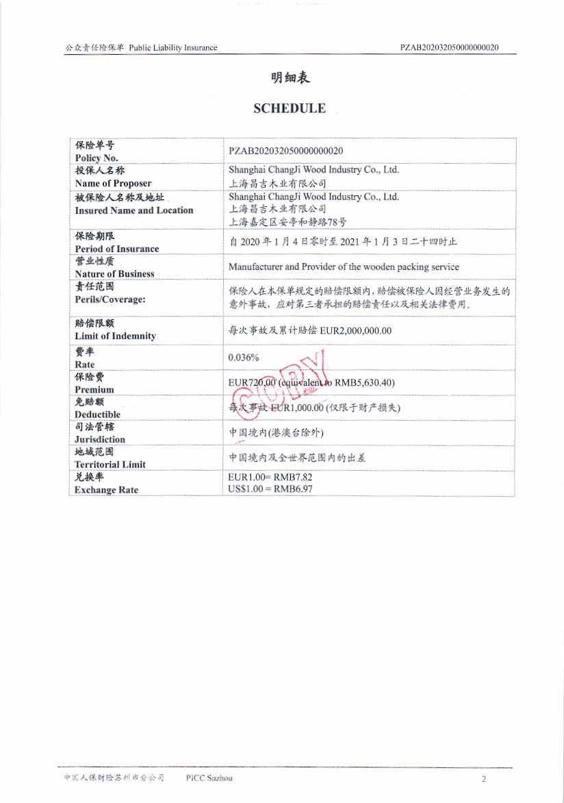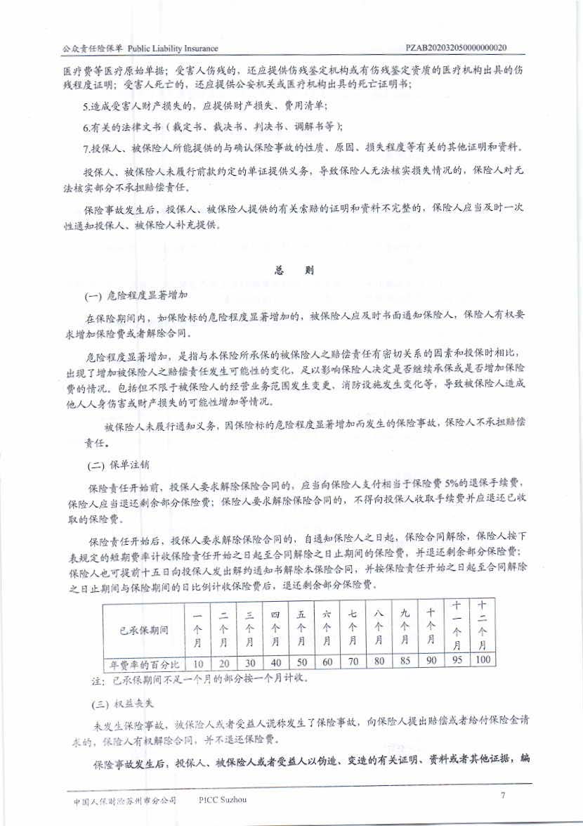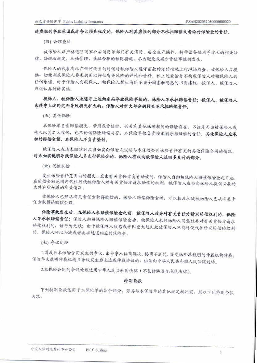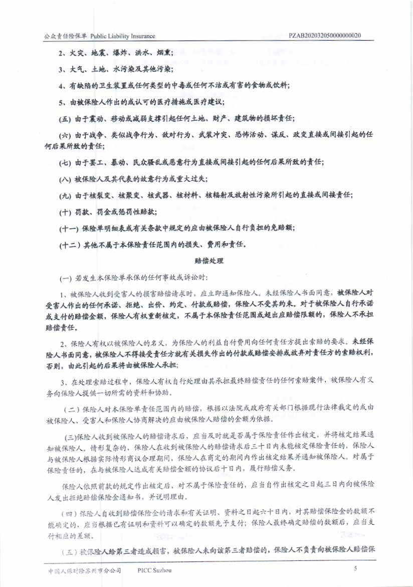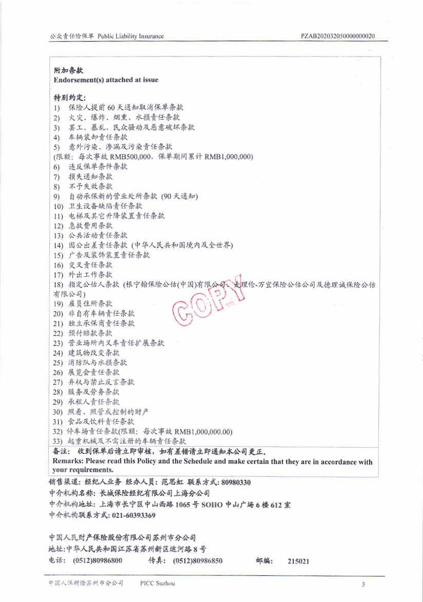 公眾責(zé)任保險 Policy No.:PZAB202032050000000020(中文版)