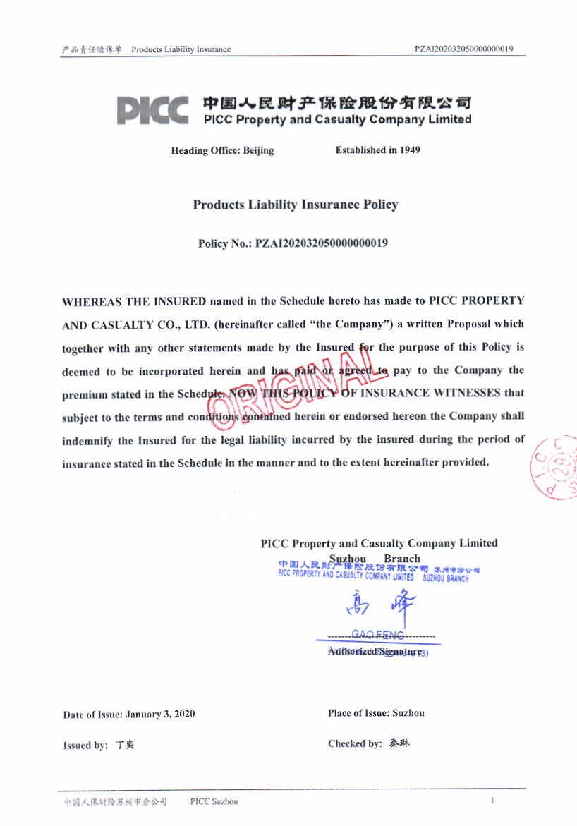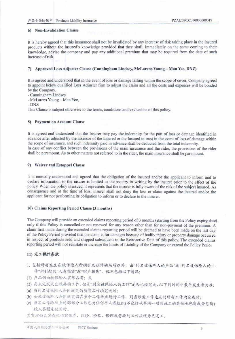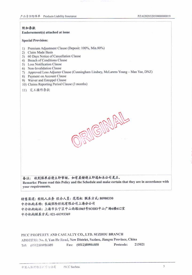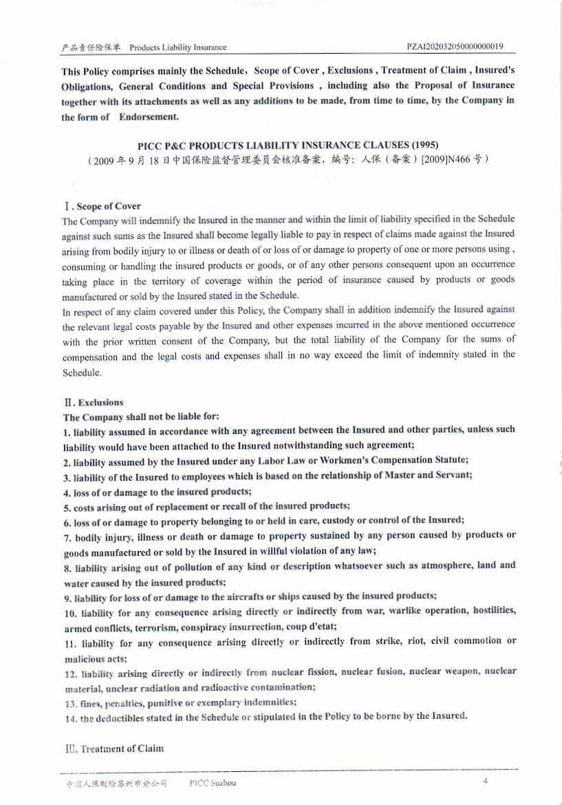 產(chǎn)品責任保險 Policy No.PZAI202032050000000019(英文版)