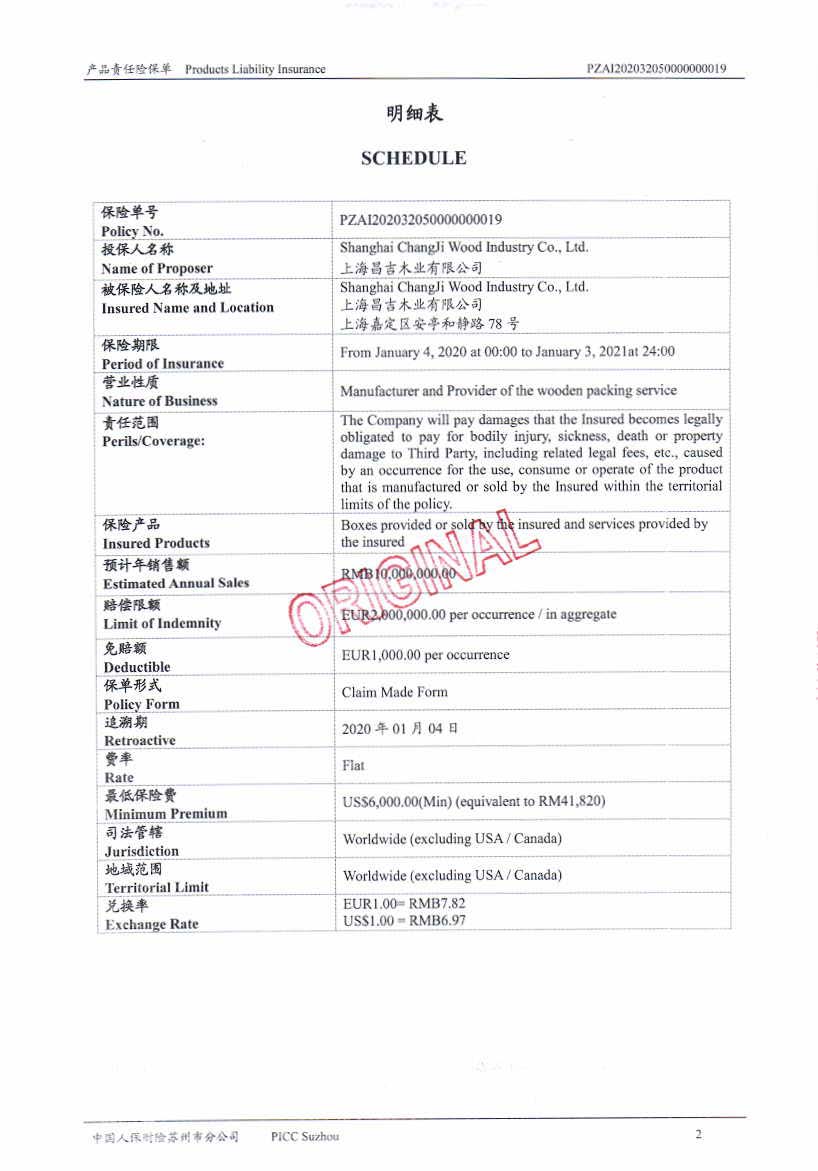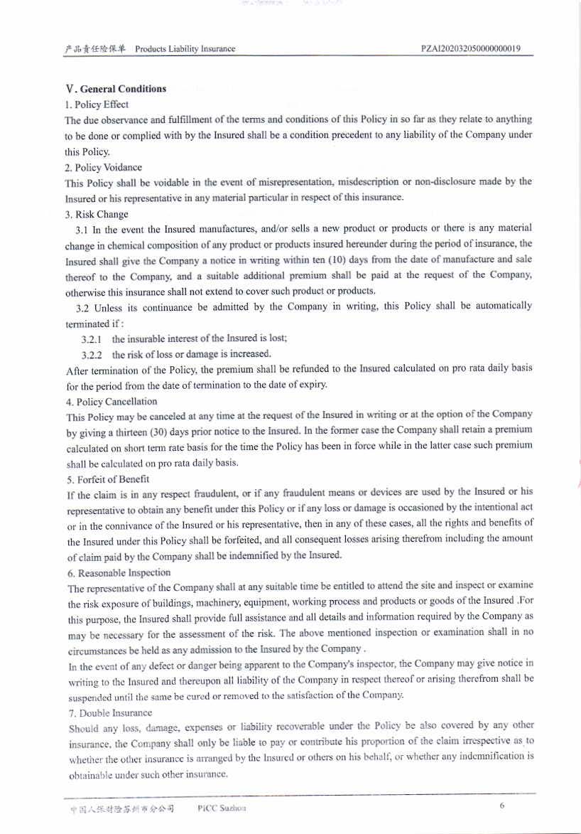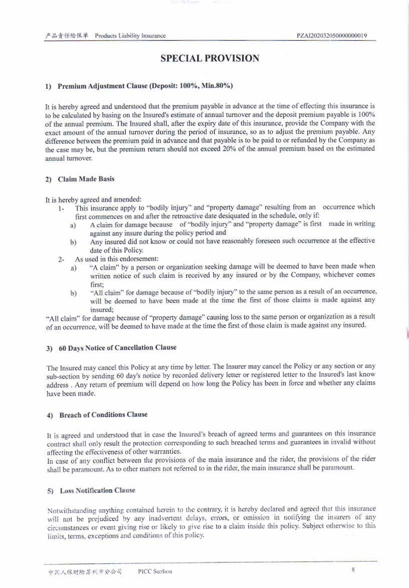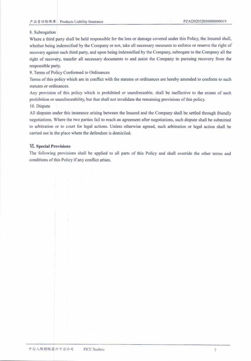 產(chǎn)品責任保險 Policy No.PZAI202032050000000019(英文版)