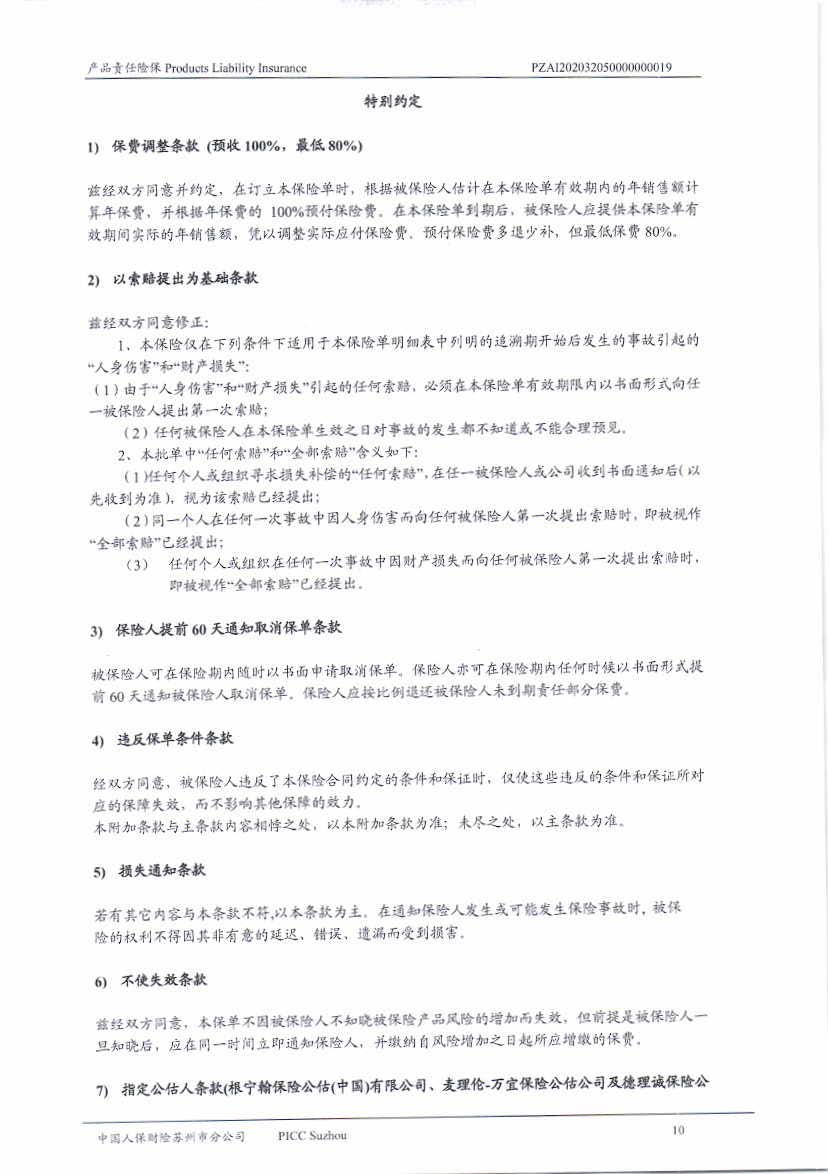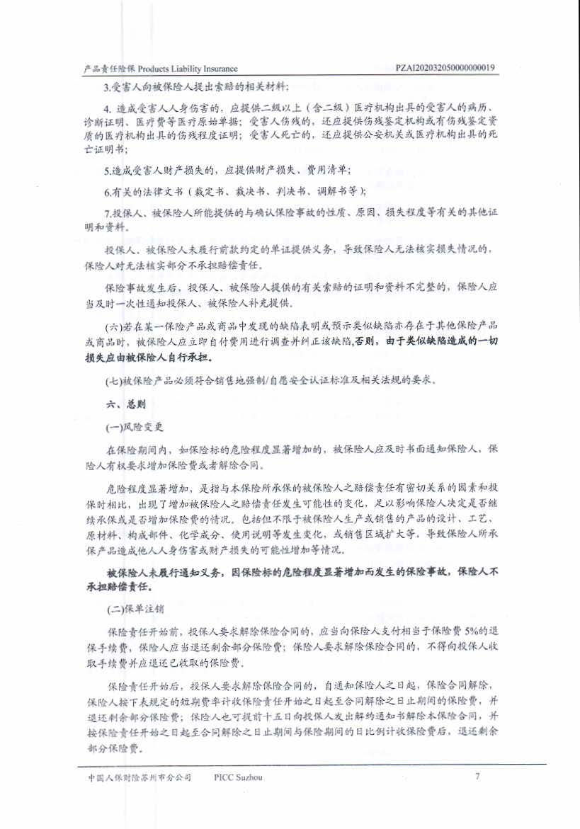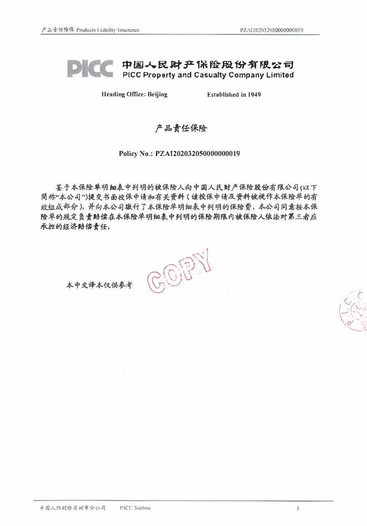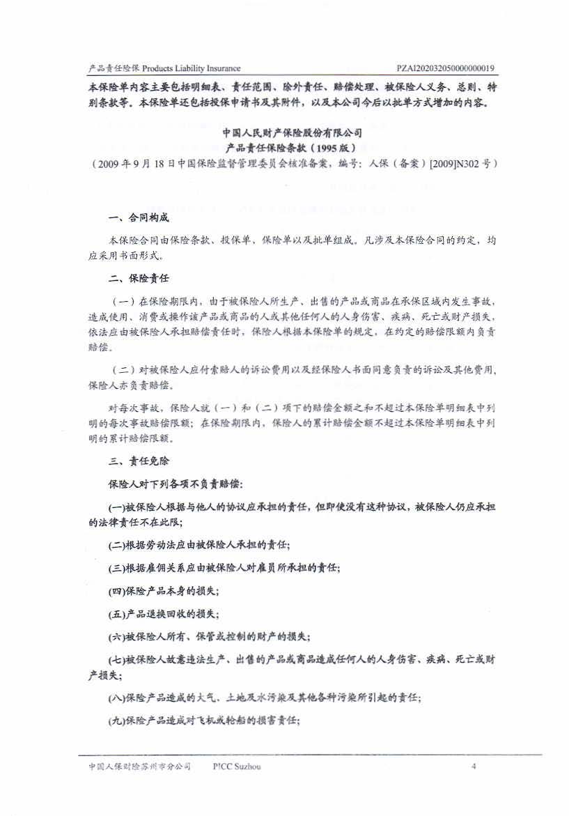 產(chǎn)品責(zé)任保險(xiǎn) Policy No.PZAI202032050000000019(中文版)